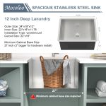 - UNDERMOUNT DEEP LAUNDRY SINK SPECIFICATION: Outer Dimensions: 24″W x 18″ D x 12″ H; Interior Bowl Dimension: 22″W x 16″ D x 12″ H; Min. cabinet base: 27″ or bigger for secure hardware installation. Standard 3 1/2″ drain opening is available for garbage disposal set