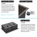 - SPECIFICATION OF 33″ BLACK DOUBLE BOWL KITCHEN SINK 50/50: Outer Dimensions:33″Wx22″Dx10″H, Min. cabinet base: 36″ or bigger for secure hardware installation. Standard 3.5″ drain opening is available for garbage disposal set