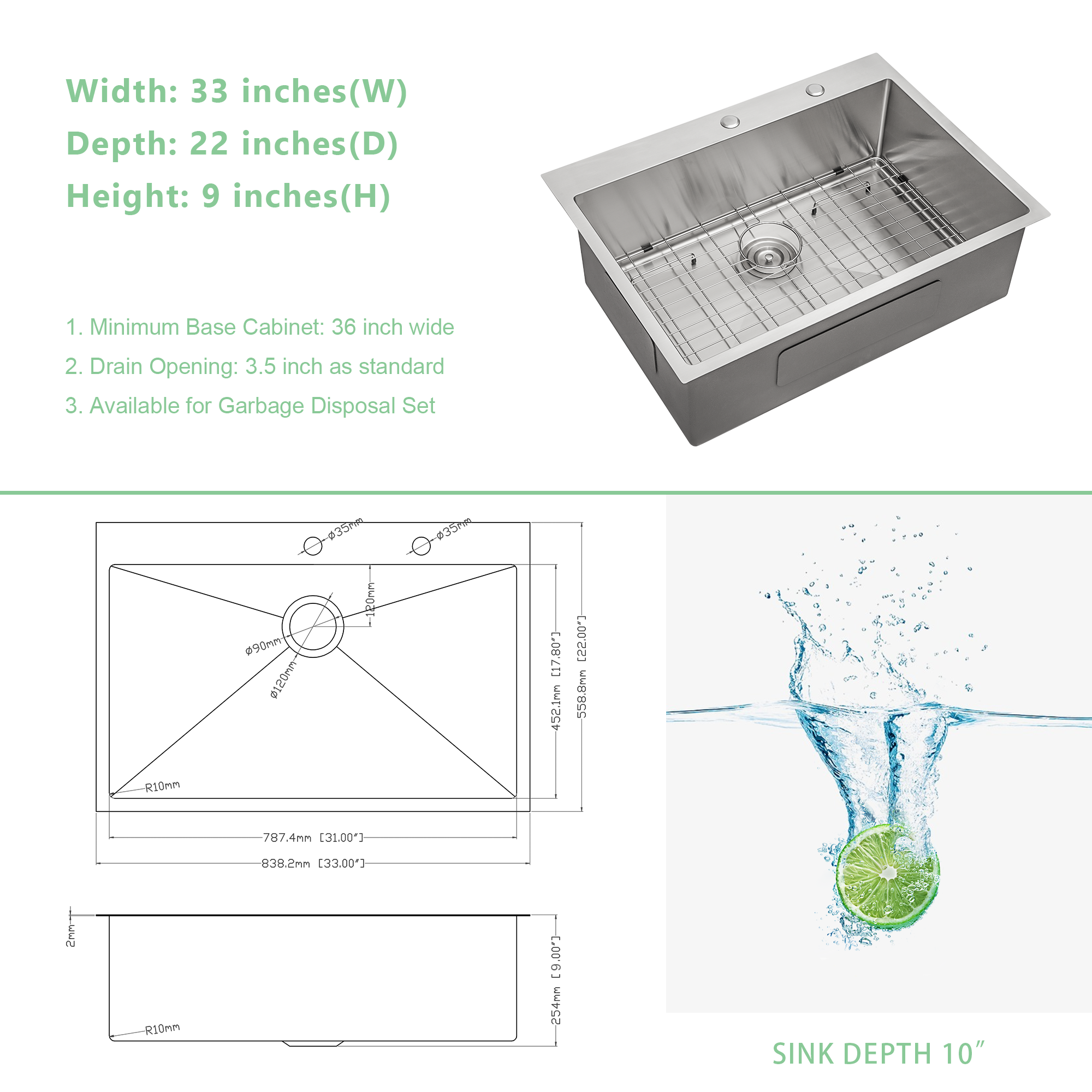 Upgrade your kitchen with our premium stainless steel kitchen sink. This 33-inch drop-in kitchen sink is crafted from high-quality stainless steel, offering corrosion resistance and scratch protection. The X-shaped guide lines at the bottom and the rear drain hole design facilitate faster water drainage and easy installation of a garbage disposal. This top-mount stainless steel kitchen sink comes with a multi-functional pull-out faucet and a soap dispenser, meeting all your kitchen needs. Additionally, the drop-in kitchen sink is not only easy to install but also perfectly complements your kitchen style.